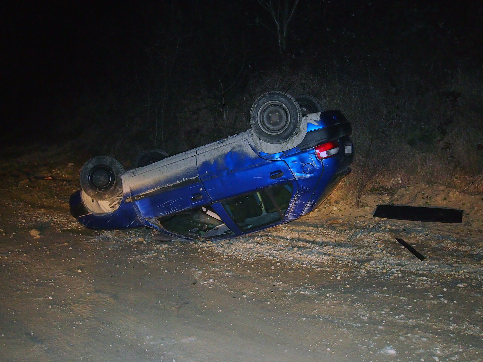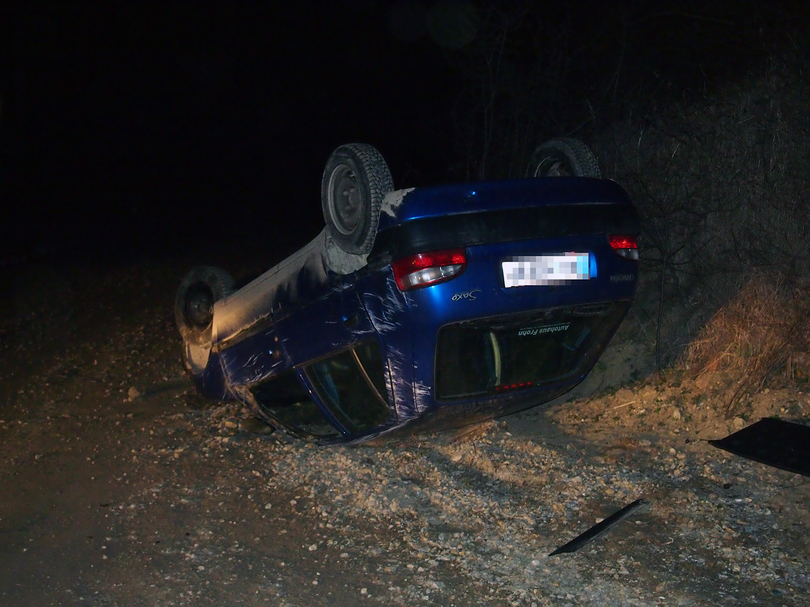 Einsatzbild beim Eintreffen an der Unfallstelle: Der PKW kam in Folge eines Fahrfehlers des Lenkers ins Schleudern und landete auf dem Dach. Der Lenker blieb unverletzt.