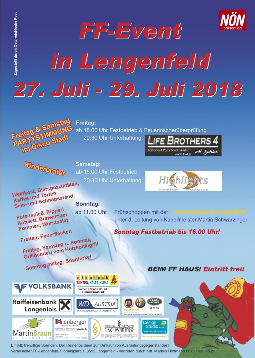 Vom 27. – 29. Juli 2018 findet wieder das alljährliche FF-Event statt. Die Feuerwehr Lengenfeld möchte Sie dazu herzlichst einladen!