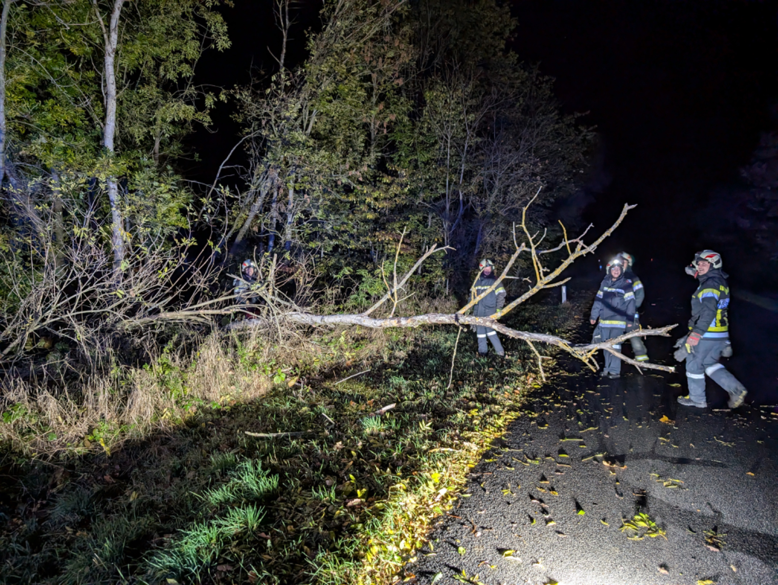 Mittels Motorkettensäge konnten die Feuerwehrkameraden den Baum beseitigen. Anschließend führte die Mannschaft noch eine Kontrollfahrt durch, ob eventuell weitere Bäume die Fahrbahn querten. Dabei konnte ein weiterer, kleinerer Ast entdeckt werden, welcher ebenfalls von den Feuerwehrmitgliedern weggeräumt wurde.