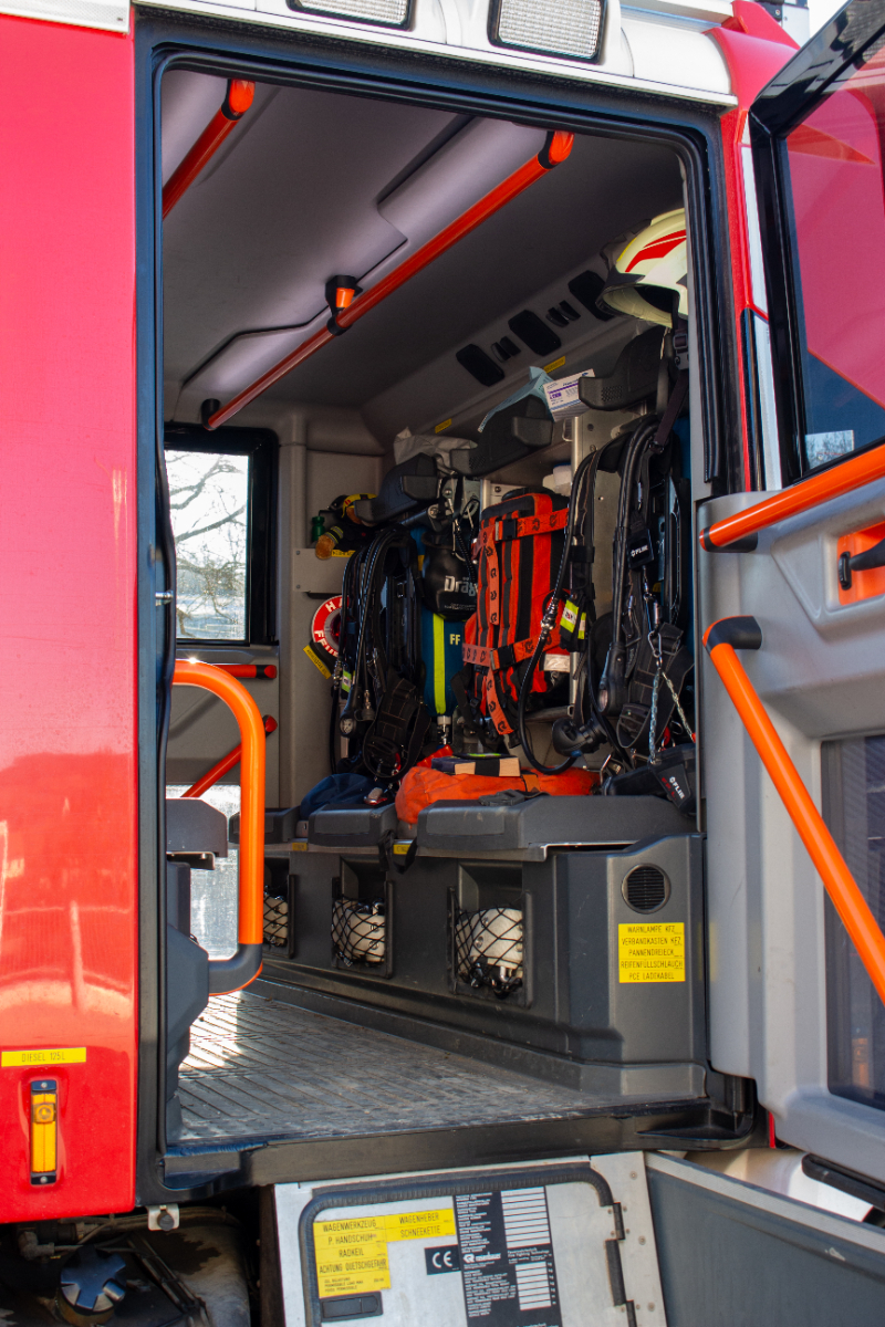 Weiteres wurden 4 statt nur 3 Atemschutzgeräte der Firma MSA Auer (300 Bar) im Mannschaftsraum installiert. Dies erleichtert nicht nur die Menschenrettung bei Innenangriffen, sondern ermöglicht auch einen Außenangriff mit 2 Atemschutztrupps.