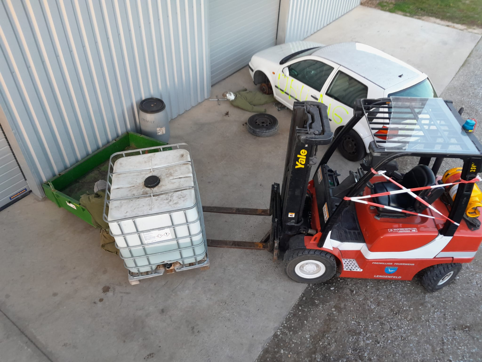 Angenommen wurde ein Unfall vor einer landwirtschaftlich genutzten Halle. Ein Gabelstapler transportierte einen mit Flüssigkeit gefüllten IBC-Container. Plötzlich musste der Fahrer aufgrund eines Kindes ein abruptes Ausweichmanöver durchführen. Dabei kollidierte er sowohl mit dem Kind als auch mit einem PKW, an dem gerade Reparaturarbeiten stattfanden. Der Mechaniker, der den linken Vorderreifen des PKWs gerade wechselte, wurde unter dem Fahrzeug eingeklemmt. Durch die Vollbremsung rutschte der Container von der Gabel und klemmte eine weitere Person darunter ein.