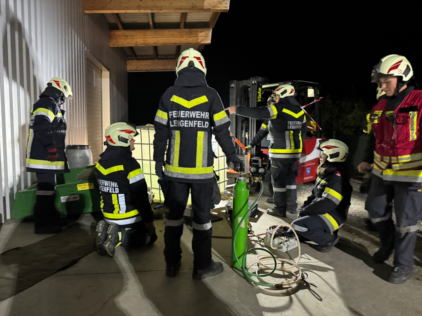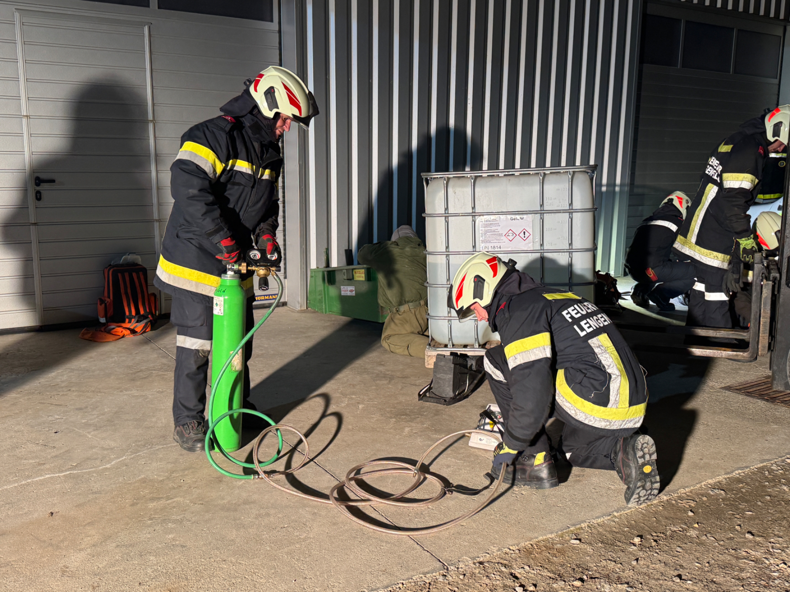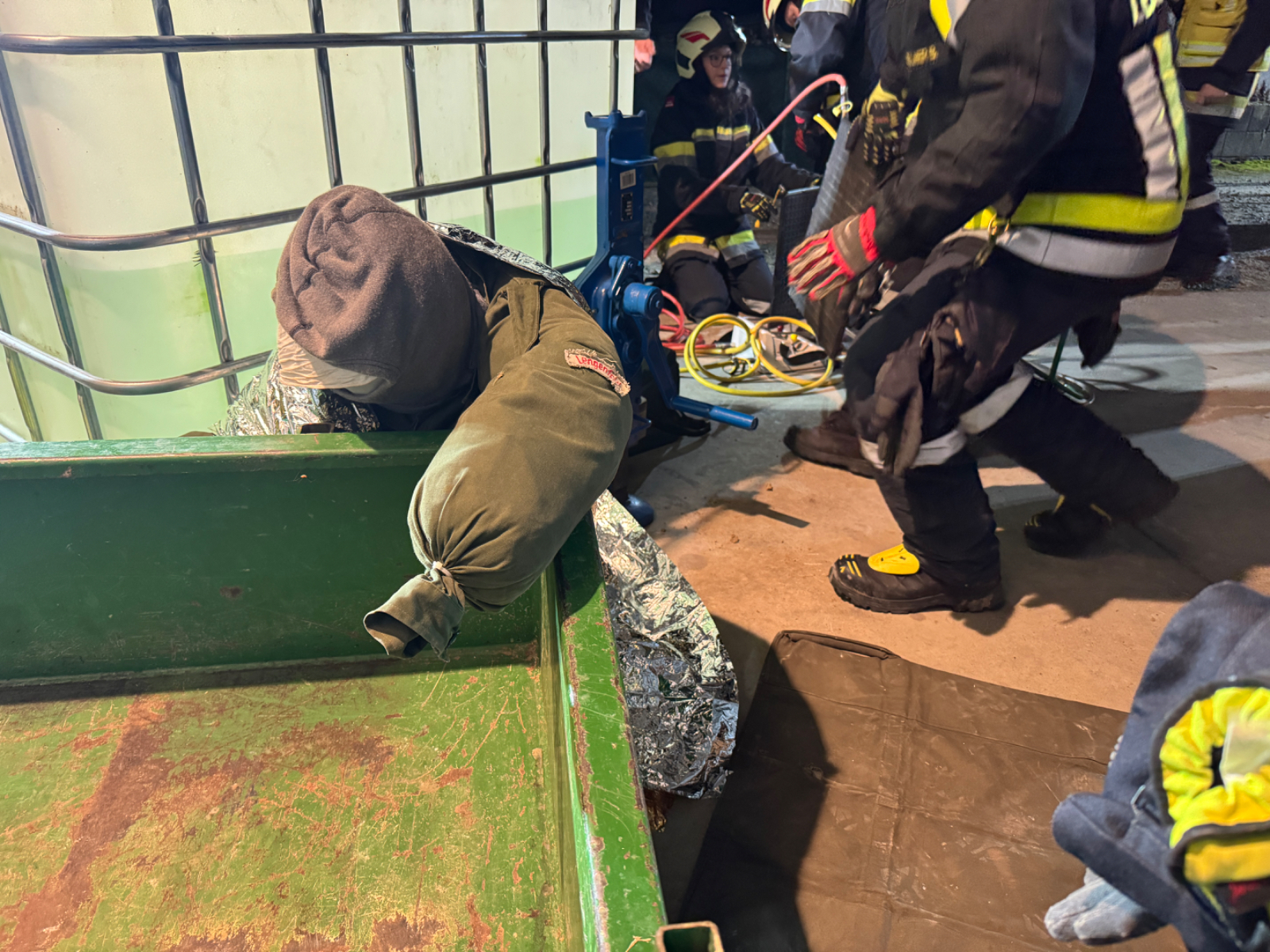 Parallel dazu holte der Einsatzleiter Informationen über den im Container befindlichen Stoff ein. Mithilfe von zwei Hebekissen konnte die erste eingeklemmte Person rasch befreit werden. Auch der Mechaniker konnte wenig später unter Einsatz des neuen Akku-Kombigeräts sicher aus seiner Zwangslage gerettet werden.